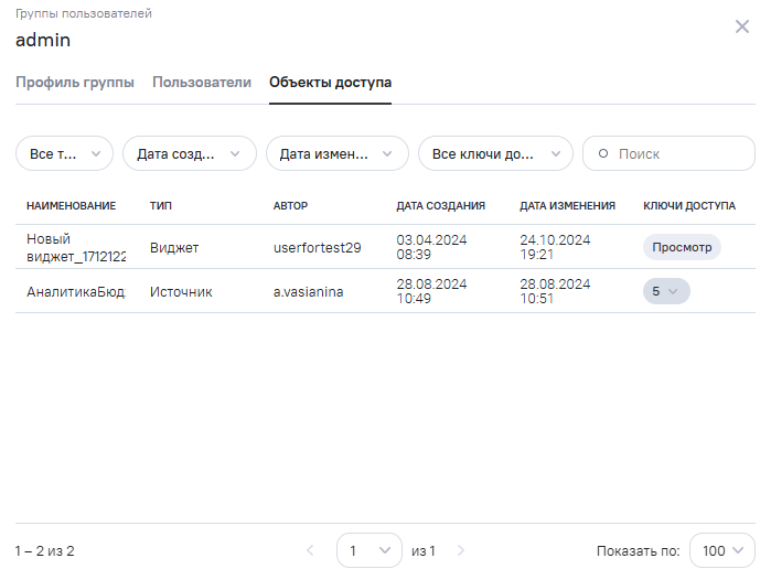 Пользовательские группы создаются, редактируются и удаляются администраторами. Пользовательские группы позволяют создать и сохранить целевой набор разрешений на доступ к объектам Системы: конкретным источникам, моделям, виджетам и информационным панелям и присвоить эти права пользователям.