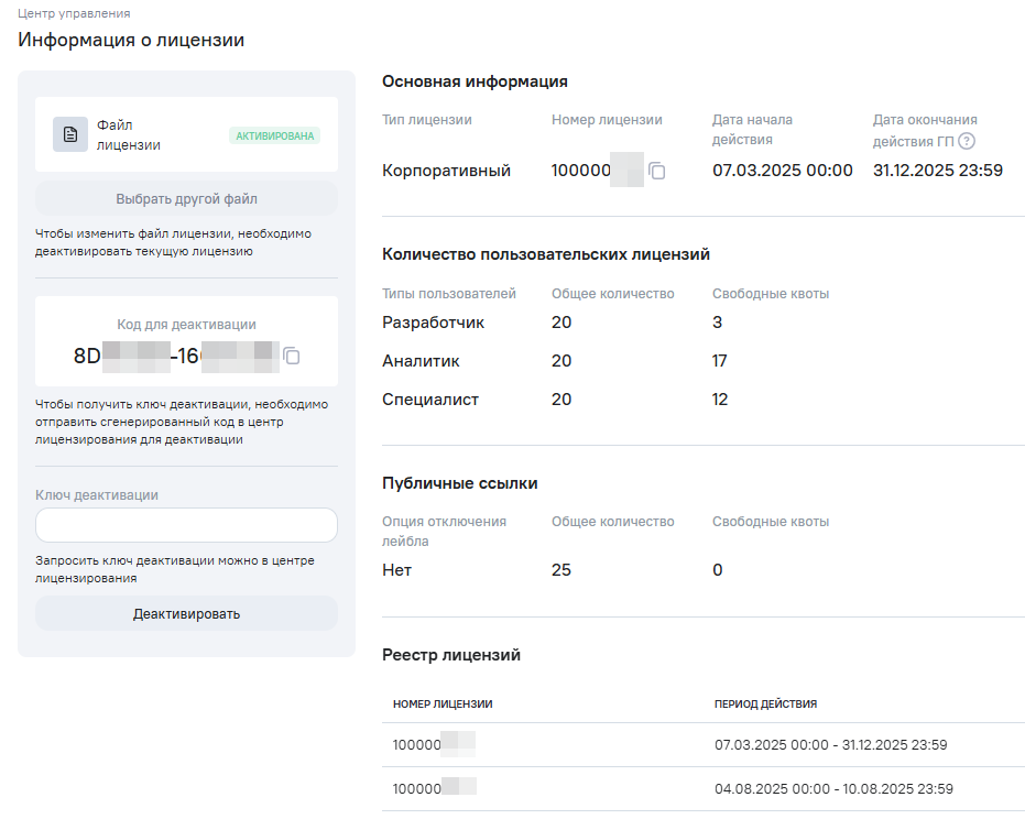 блок Публичные ссылки- функциональные лицензии, определяющие квоты на количество активных публичных ссылок. Если блок отсутствует, то создание и работа с публичными ссылками недоступны в рамках установленной лицензии^