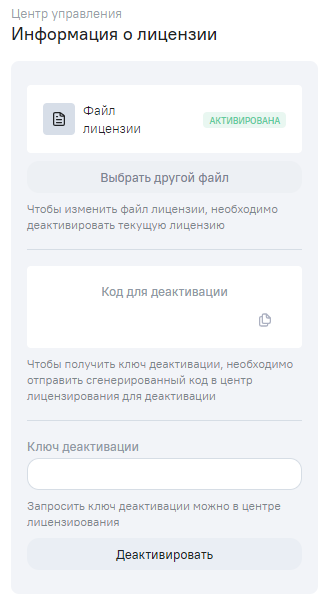 Выбрать другой файл, которая позволяет заменить файл лицензии. Кнопка активна до активации или после деактивации лицензии. После загрузки файла лицензии в Систему необходимо выполнить активацию лицензии;
