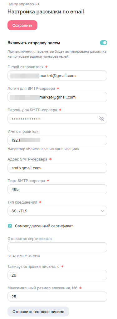 Настройки Самоподписной сертификат, Отпечаток сертификата, Таймаут отправки письма, с и Максимальный размер вложения, Мб доступны только при выборе типа шифрования SSL/TLS