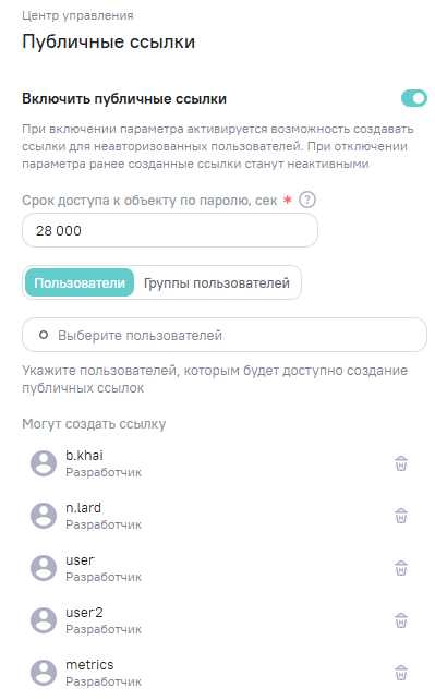 блок для выбора пользователей или групп пользователей - при доступе к работе с публичными ссылками, генерация новых ссылок доступна всем пользователям с типами Разработчик и Аналитик. Ссылки можно создавать при наличии свободных квот на публичные ссылки из числа доступных по лицензии. Для ограничения списка пользователей выберите конкретных пользователей или группы пользователей;
