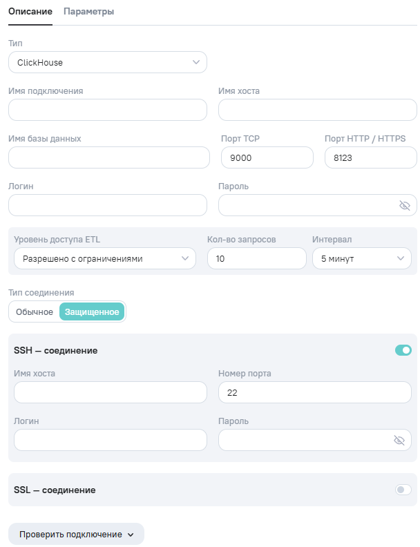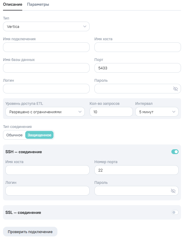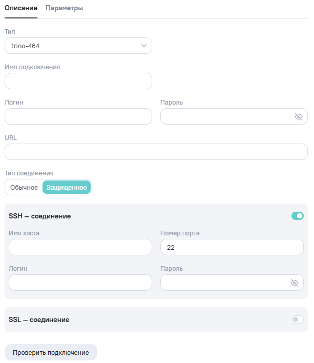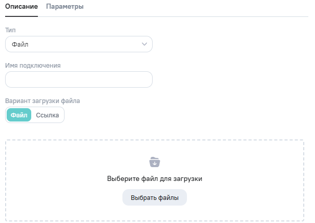 Набор полей на вкладке Описание зависит от выбора в поле Тип. Наименование источника указывается в поле Имя подключения.