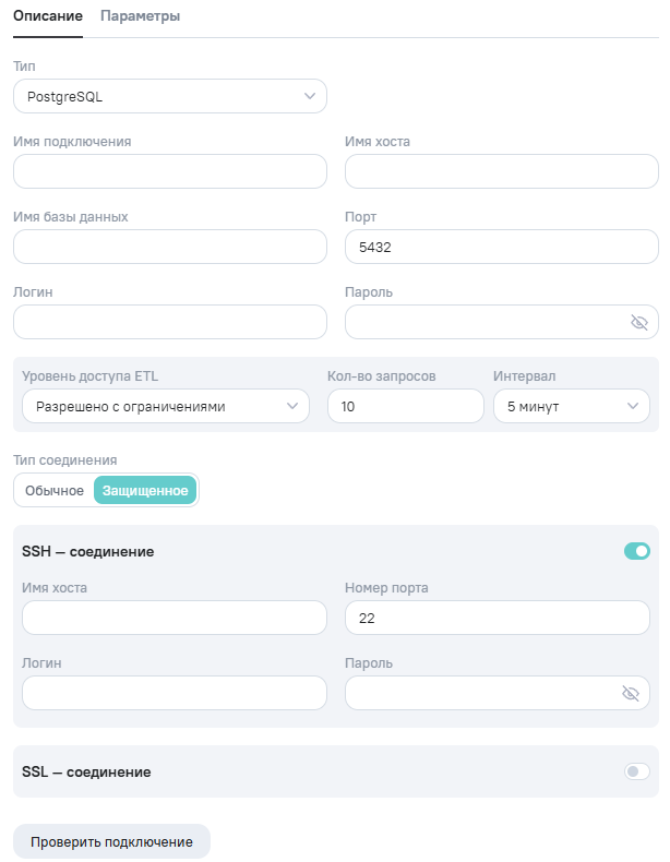 Интерфейс подключения источника типа PostgreSQL содержит:
