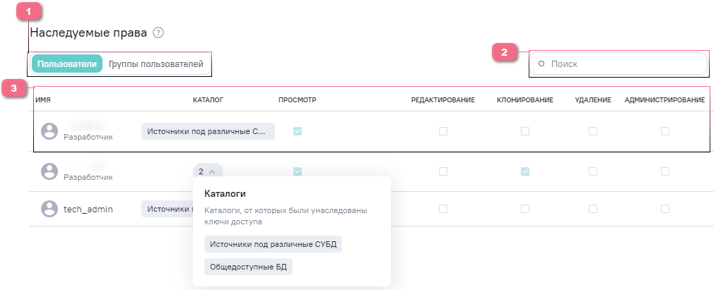 1.Вкладки Пользователи и Группы пользователей для просмотра пользователей или групп пользователей с доступом.