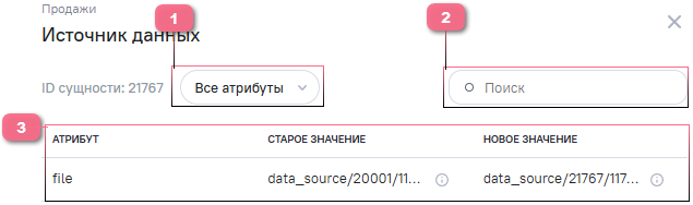 Пользователь Системы при наличии у него права на просмотр, редактирование и администрирование источника может посмотреть историю изменений по сущностям выбранного объекта. Такое право он по умолчанию получает на созданные им источники данных.
