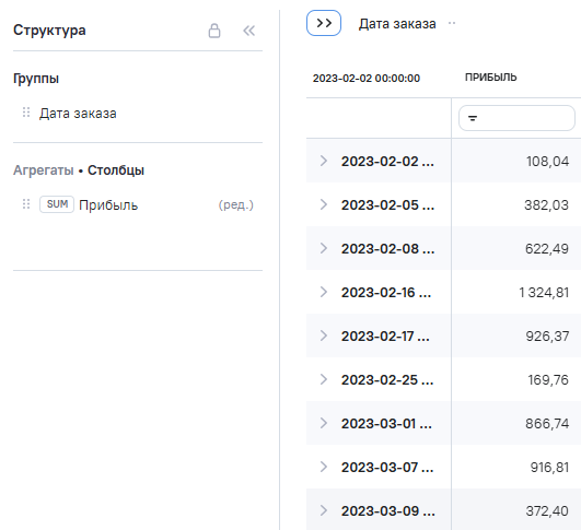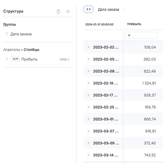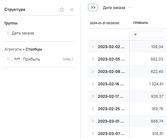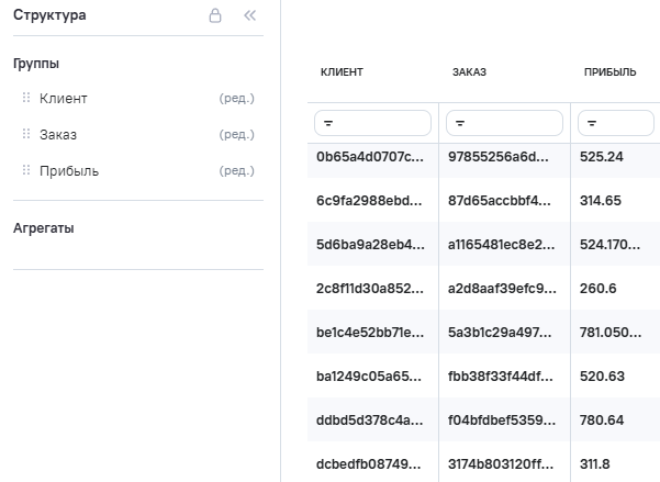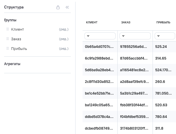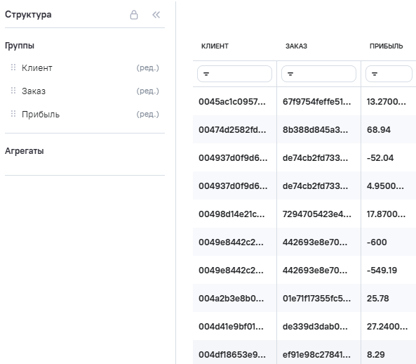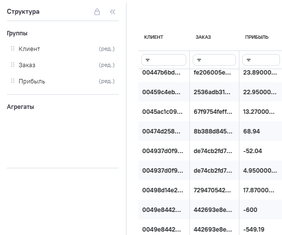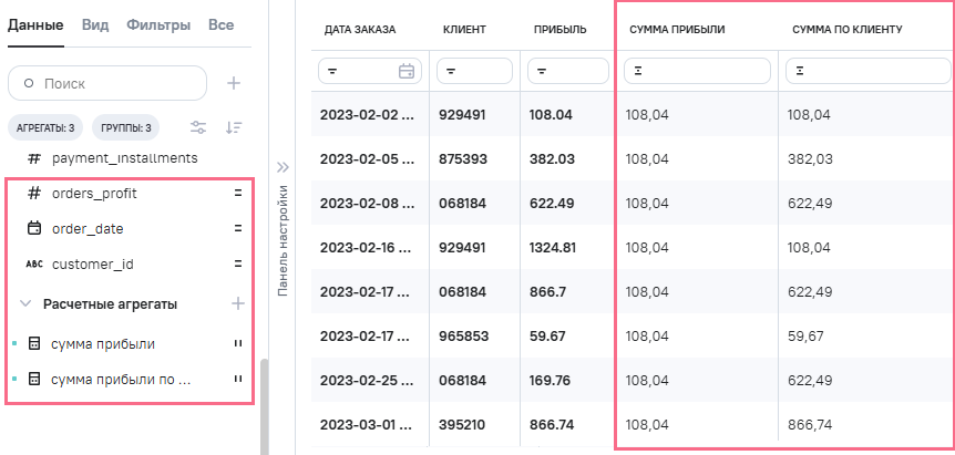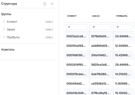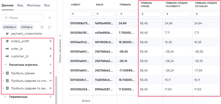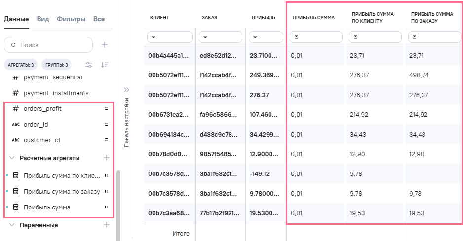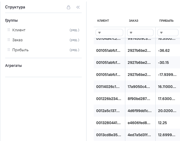 2.На вкладке Данные поля Orders_profit (прибыль) и Order_id (заказ) определены как Группы.