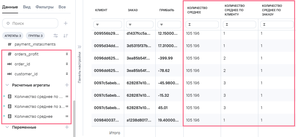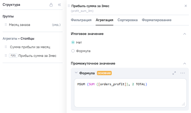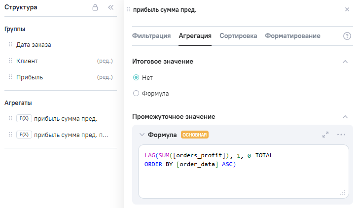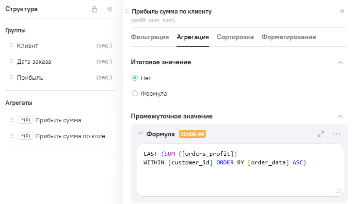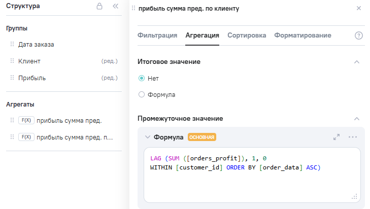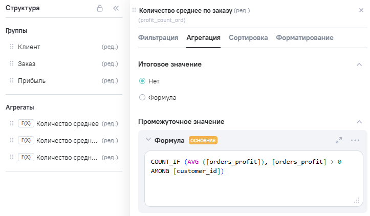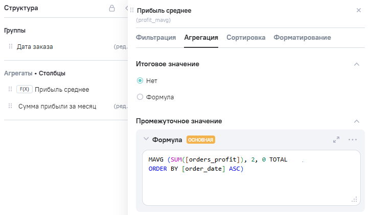 2.В Расчетные агрегаты добавлен новый агрегат Profit_orders (прибыль по заказу), в Промежутоное значение указана формула ZN ([profit]/[orders]).