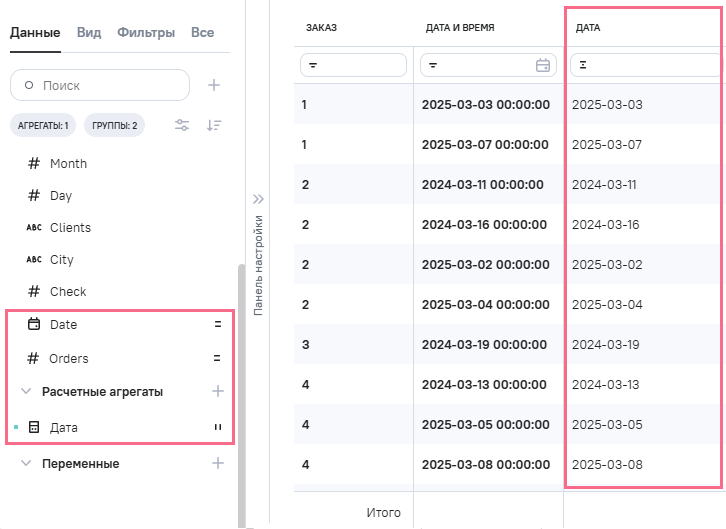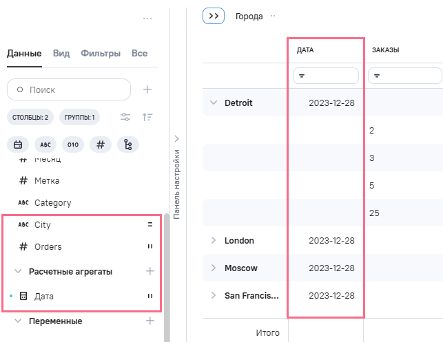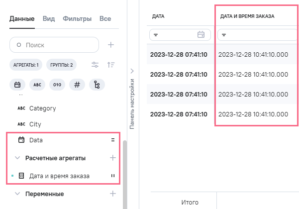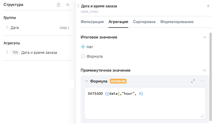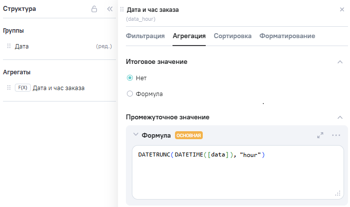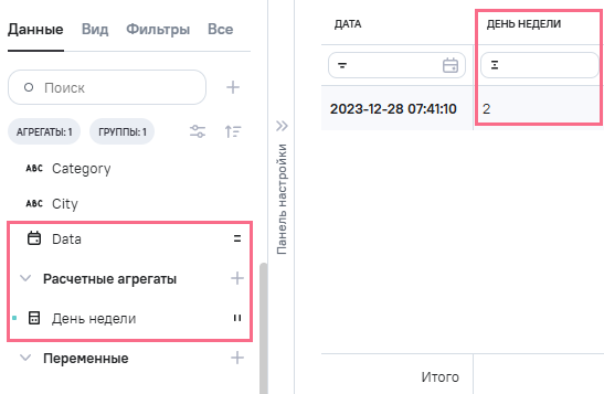 2.В Расчетные агрегаты добавлен новый агрегат Date_week (неделя), в Промежутоное значение указана формула WEEK ([data]).