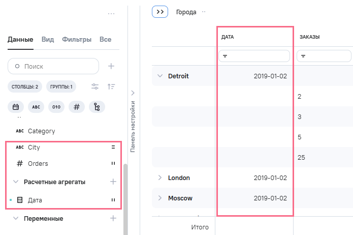 1.В виджете на вкладке Данные поле City (город) определено как Группы, поле Orders (заказы) определено как Столбцы.