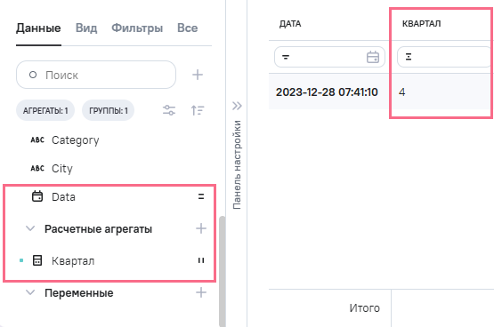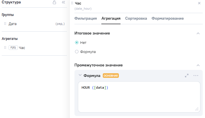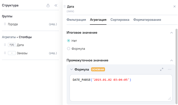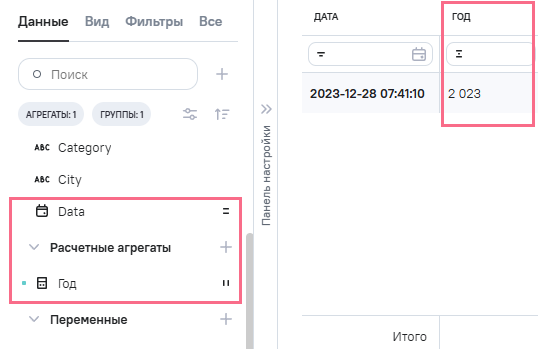 2.В Расчетные агрегаты добавлен новый агрегат Date_year (год), в Промежутоное значение указана формула YEAR ([data]).