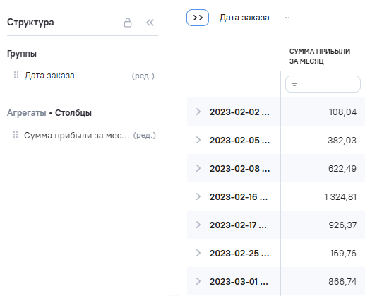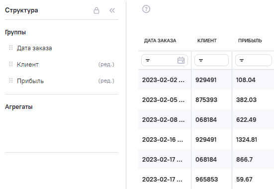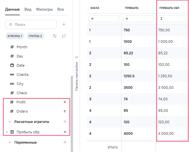 2.На вкладке Данные поля Profit (прибыль) и Orders (заказы) определены как Группы.