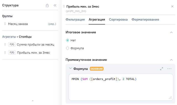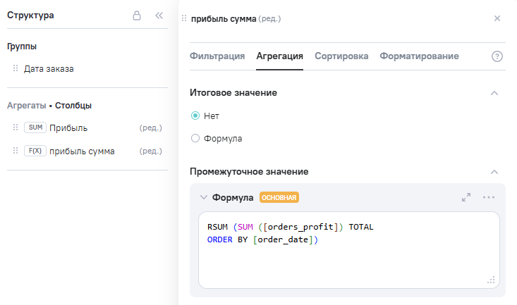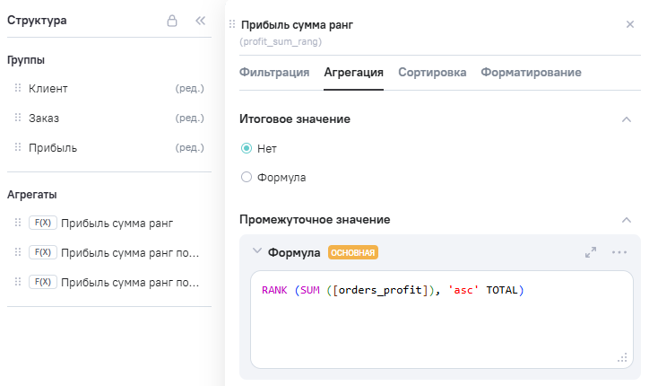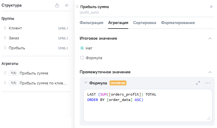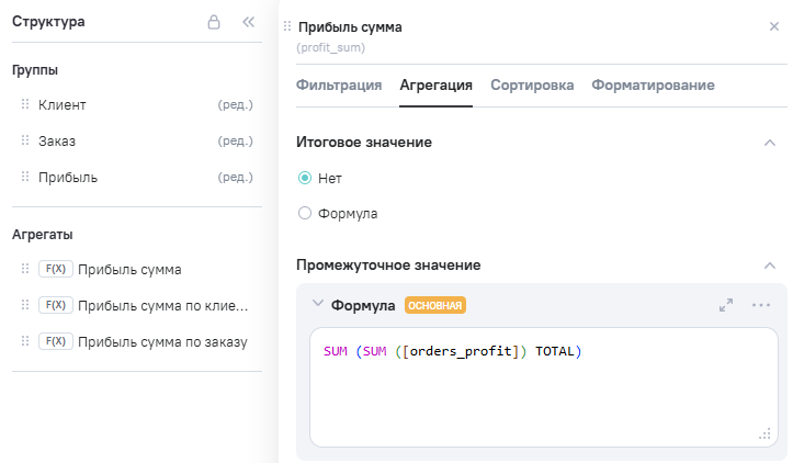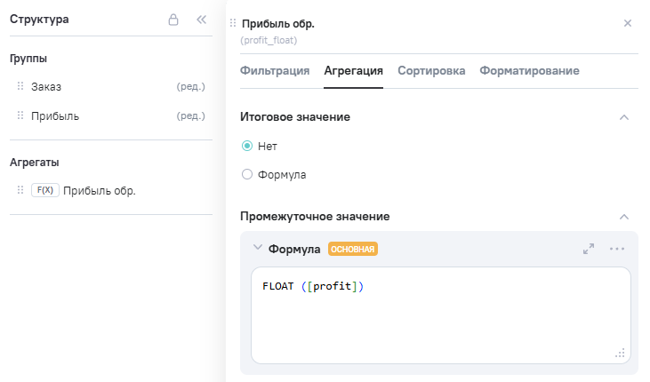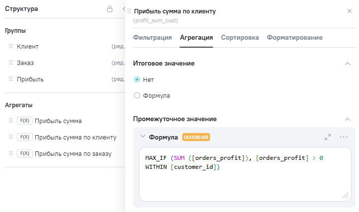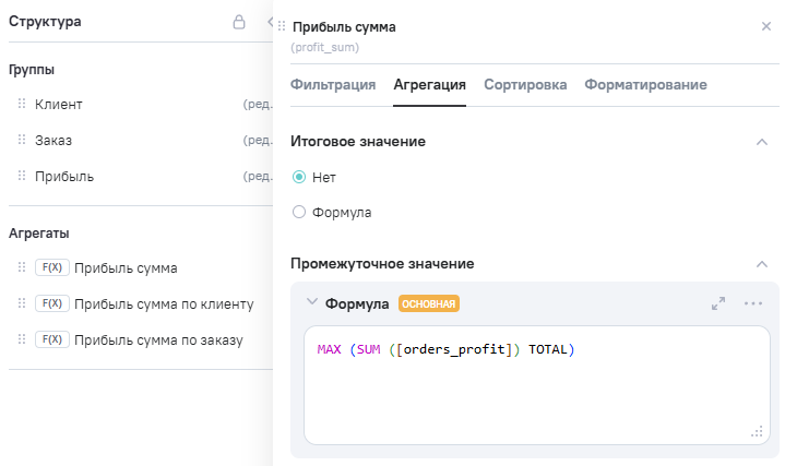3.В Расчетные агрегаты добавлен новый агрегат Profit_abs (прибыль абсолют), в Промежуточное значение указана формула ABS ([orders_profit]).