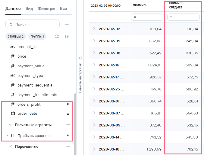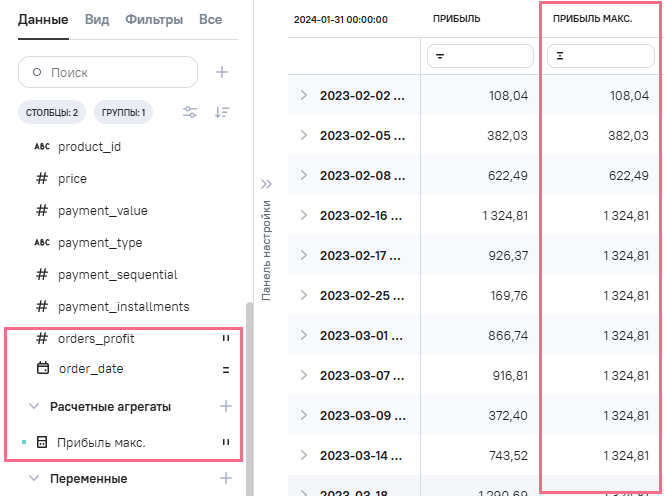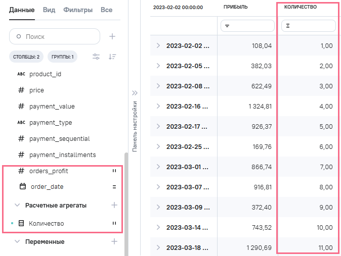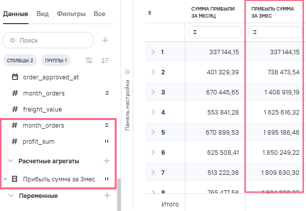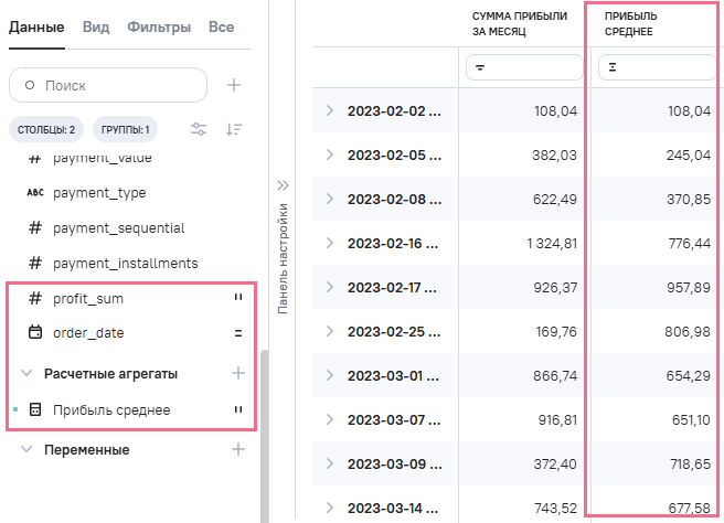 2.На вкладке Данные поля Orders_profit (прибыль) и Freight_value (доставка) определены как Группы.