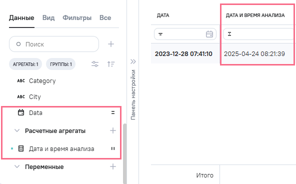 2.В Расчетные агрегаты добавлен новый агрегат Date_analysis (дата анализа), в Промежутоное значение указана формула TODAY ().