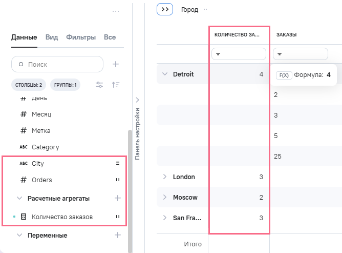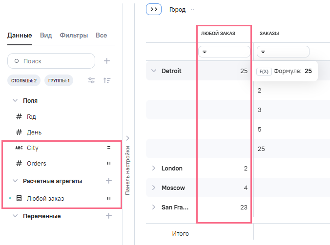 (любой заказ), в Промежуточное значение указана формула ANY([orders])