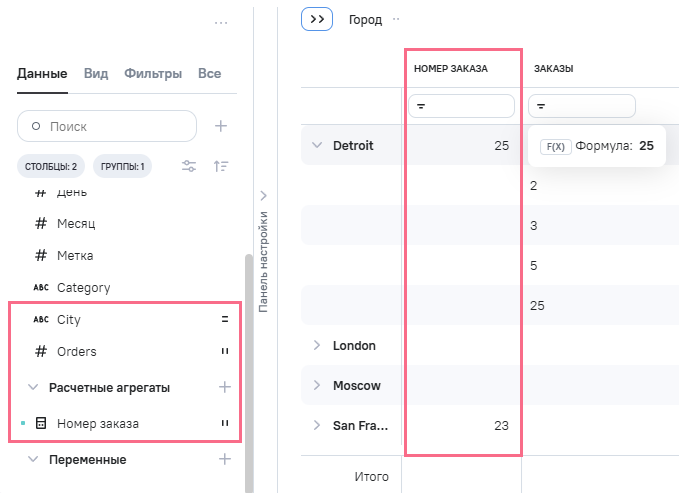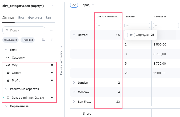 (номер заказа), в Промежуточное значение указана формула MIN_IF ([orders], [orders] <= 10)