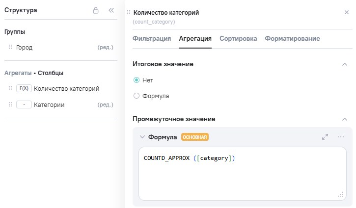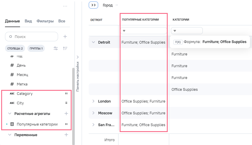 (популярные категории), в Промежуточное значение указана формула TOP_CONCAT([category], 2, '; ')