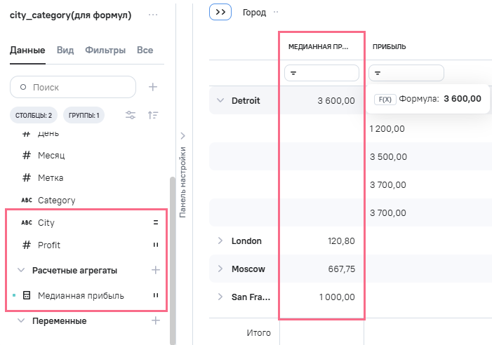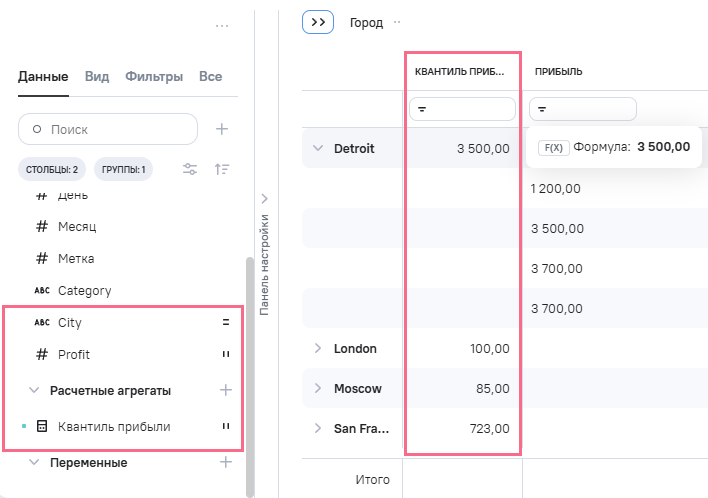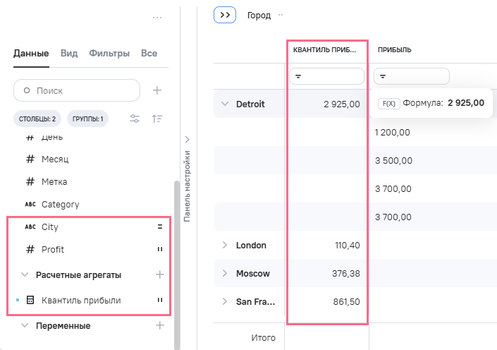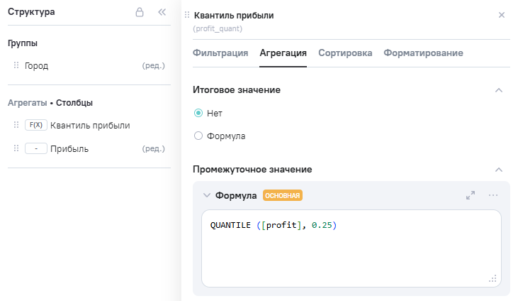 (квантиль прибыли), в Промежуточное значение указана формула QUANTILE_APPROX ([profit], 0.25)