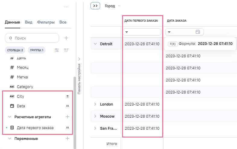 (дата первого заказа), в Промежуточное значение указана формула MIN ([data])