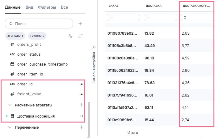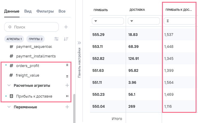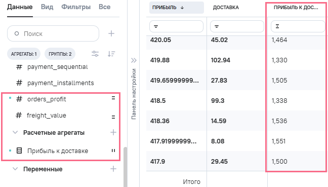 (прибыль к доставке), в Промежуточное значение указана формула ASIN ([orders_profit]*[freight_value])