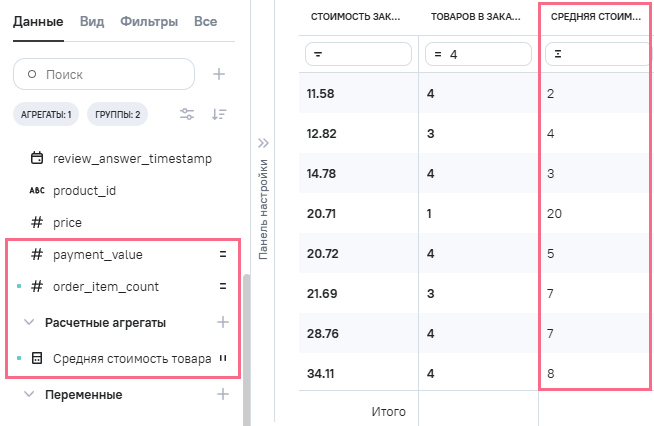 (средняя стоимость товара), в Промежуточное значение указана формула DIV ([payment_value], [order_item_count])