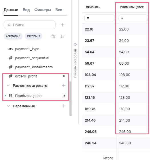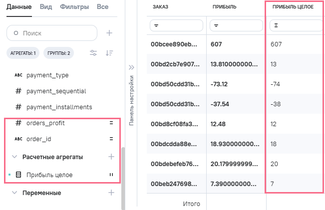 (прибыль целое), в Промежуточное значение указана формула ROUND ([orders_profit])