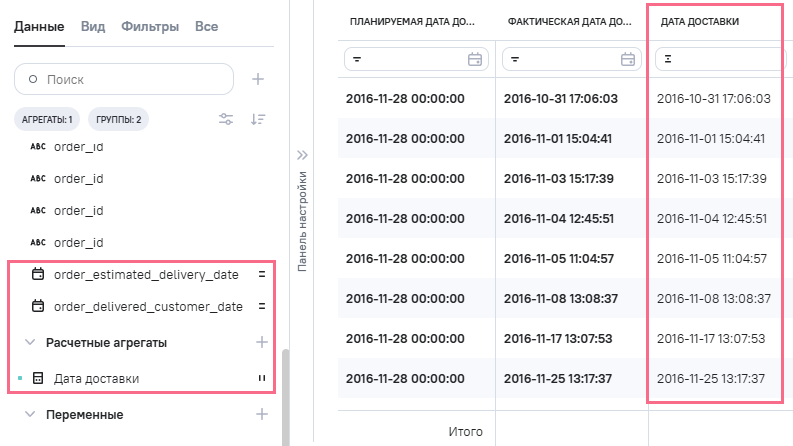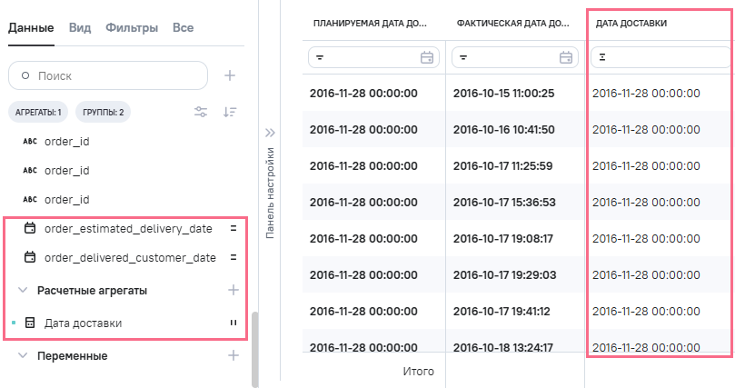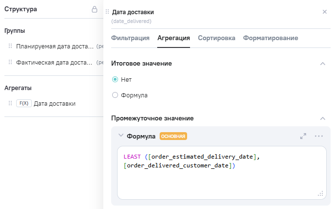 (дата доставки), в Промежуточное значение указана формула LEAST ([order_estimated_delivery_date],[order_delivered_customer_date])