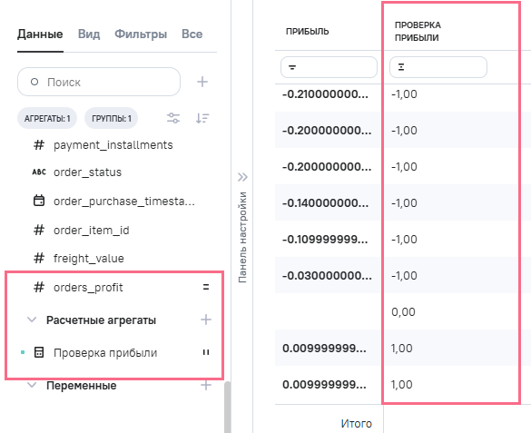 (проверка прибыли), в Промежуточное значение указана формула SIGN([orders_profit])