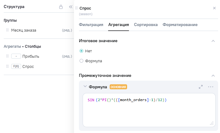 (спрос), в Промежуточное значение указана формула SIN (2*PI()(1)*(([month_orders]-1)/12))(2)