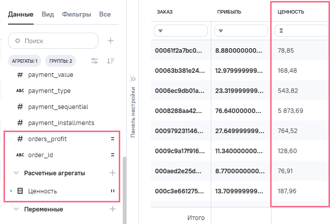 (ценность), в Промежуточное значение указана формула SQUARE([orders_profit])