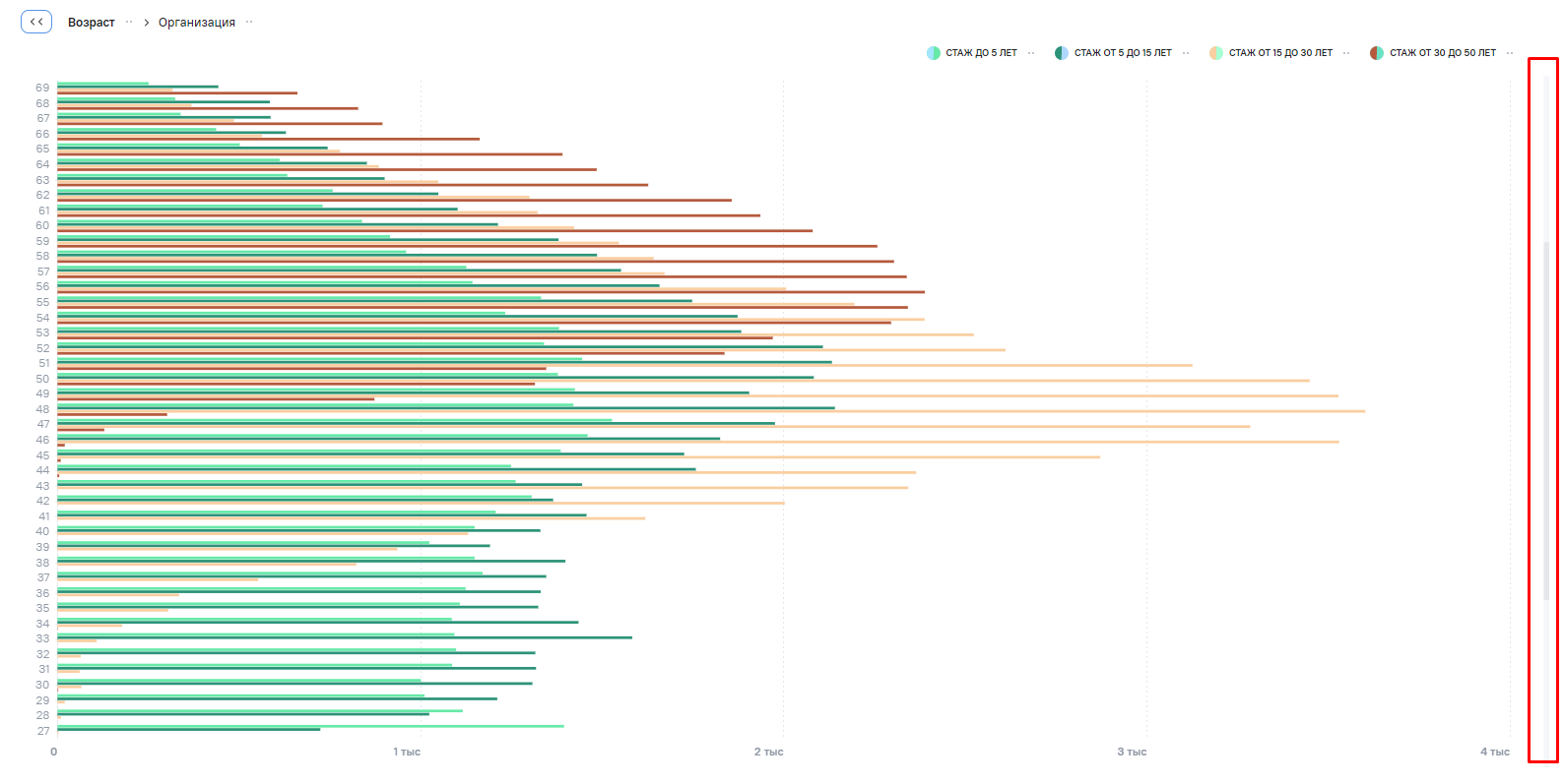 • изменение масштаба вертикальной оси с помощью прокрутки колеса мыши увеличивая/уменьшая масштаб или разводя в стороны пальцы на планшете (жест pinch). После первичного увеличения масштаба на виджете появляется дополнительная возможность масштабирования - элемент скроллинга;