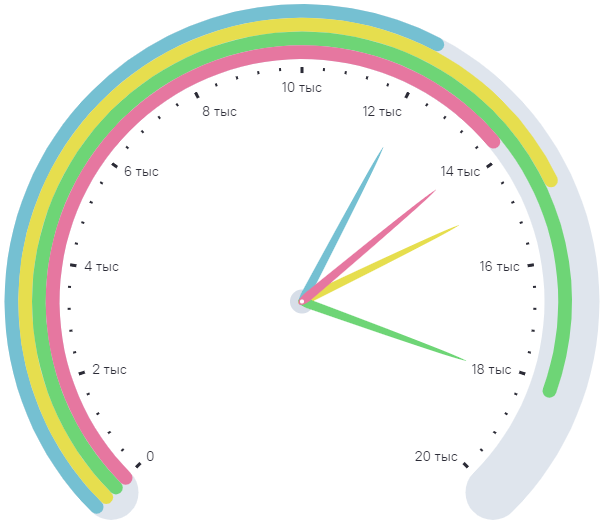 Тип виджета Датчик показывает значение одиночной меры и визуализирует пути интерпретации этого значения. Позволяет визуализировать изменение значений данных с помощью цветовой шкалы. Датчик часто используется для отображения ключевого показателя эффективности, например, на информационной панели управления, и вместе с сегментацией и цветовой кодировкой позволяет эффективно иллюстрировать достигнутые результаты. Датчик позволяет легко считывать и понимать значения, он дает представление о выполнении работы в определенной области. Данные отображаются в виде спидометра.