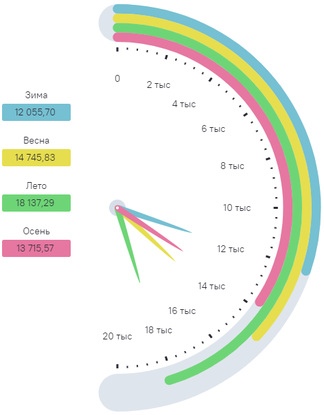 в настройке Значение оси. Может быть указан только один параметр, второй будет рассчитан автоматически.Максимальное значение оси = максимальному значению агрегата второго показателя. При отсутствии показателя устанавливается значение 100. Минимальное значение оси = минимальному значению агрегата третьего показателя. В случае отсутствия показателя устанавливается значение 0.
