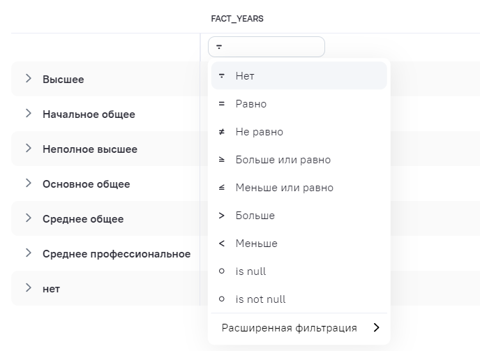Если для поля не настроена фильтрация, то в окне настроек по умолчанию отобразится список операторов базовой фильтрации.