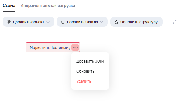 Для удаления ETL-блока в области схемы модели напротив необходимого ETL-блока нажмите на кнопку svg, откроется контекстное меню. Выберите пункт Удалить.