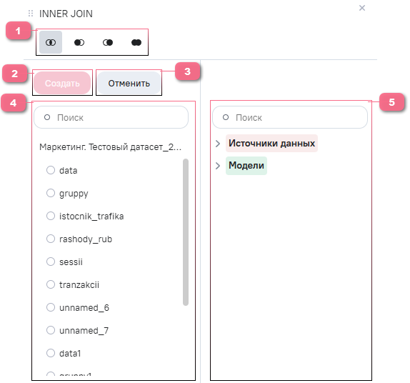 В левой части окна можно посмотреть источники данных модели. Чтобы раскрыть/скрыть иерархию, нажмите на кнопки svg и svg. Поле поиска позволяет найти источник по наименованию.