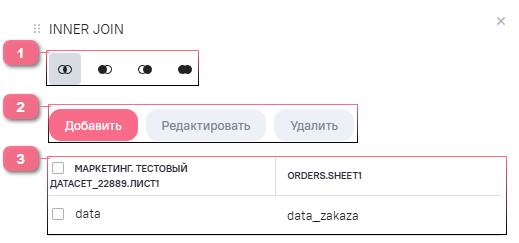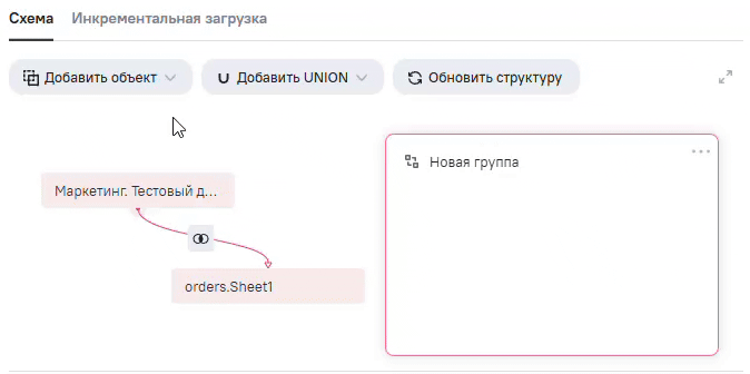 Для наполнения ETL-блока данными переместите с помощью drag-and-drop в его область блоки данных и соедините их связью типа JOIN. При перемещении связанных объектов данных в или из ETL-блока, будет перемещен сам объект и все его связанные объекты справа. Если перемещаемый объект был связан слева с другим объектом, то откроется предупреждение, что данная связь будет удалена.