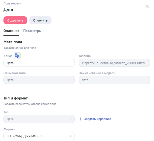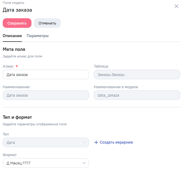 В режиме просмотра описания полей модели у каждого поля с типом Дата слева от наименования отображается пиктограмма svg. При наведении на пиктограмму отображается подсказка Для данного поля можно сформировать иерархию.