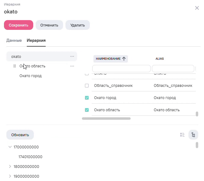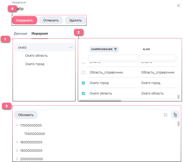 Для удаления иерархии в окне редактирования иерархии нажмите на кнопку img Удалить.
