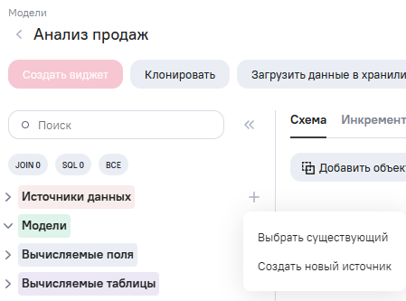 • в разделе Источники данных откройте источник данных на просмотр и нажмите на кнопку img Добавить. В выпадающем меню выберите значение Добавить в новую модель. Откроется окно редактирования новой модели с выбранным источником данных;