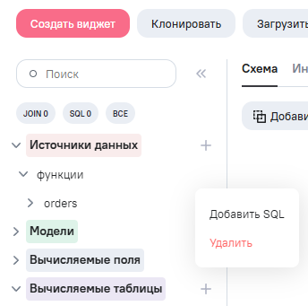 Для SQL запросов к источникам и моделям используется возможность добавить новый запрос в структуре иерархического дерева источников.
