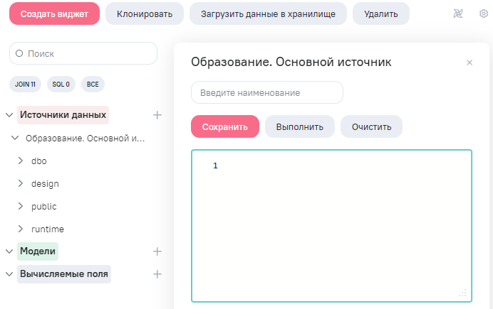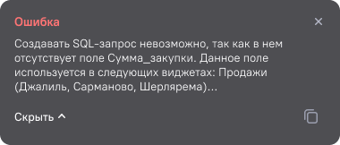 При сохранении запроса реализована проверка на наличие всех используемых полей в уже созданных виджетах, в том числе и системных виджет-фильтрах. В случае отсутствия нужных полей в запросе при сохранении отобразится уведомление: Сохранить SQL-запрос невозможно, так как в нем отсутствует поле [название_поля]. Данное поле используется в следующих виджетах: [список_виджетов].