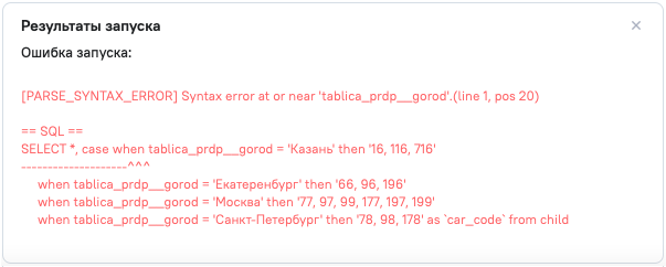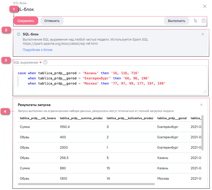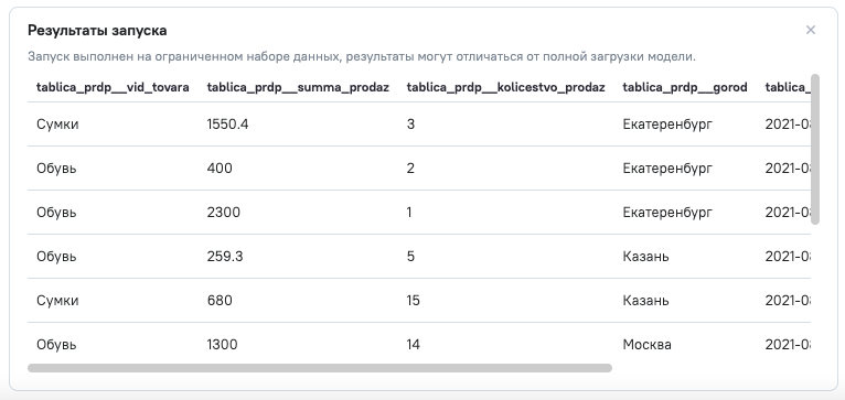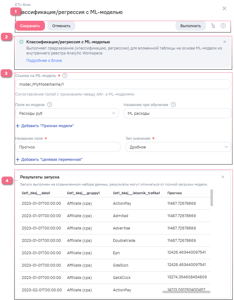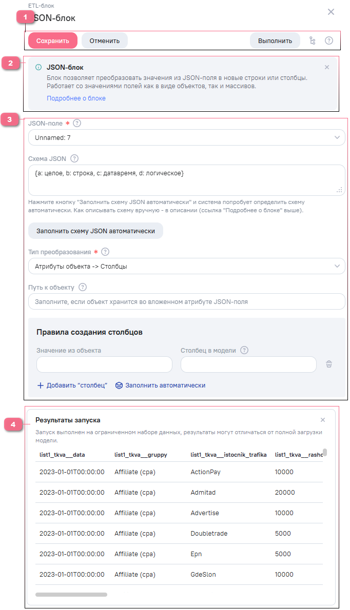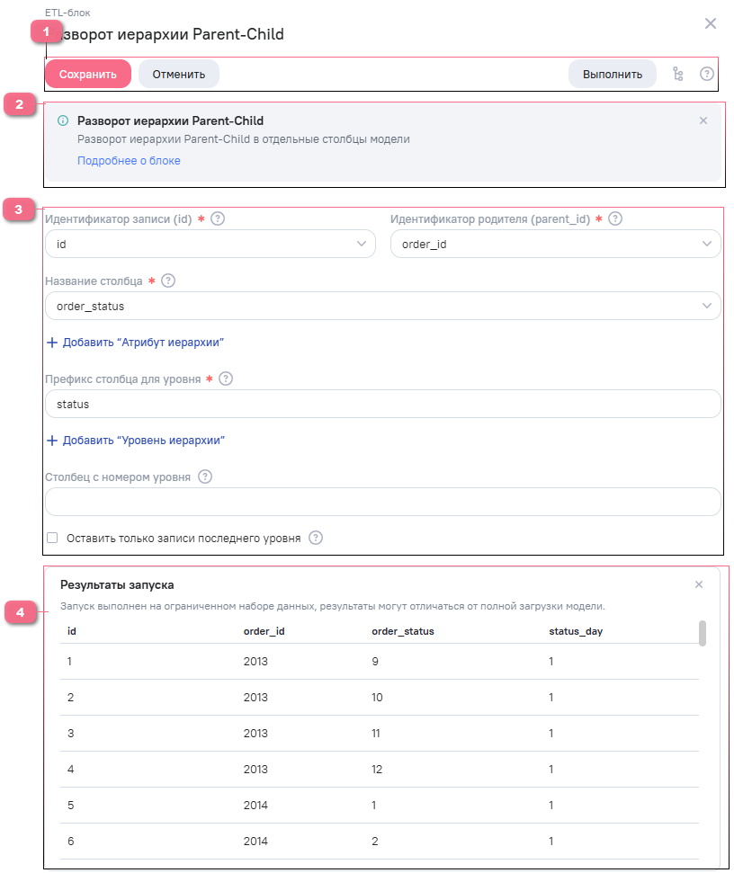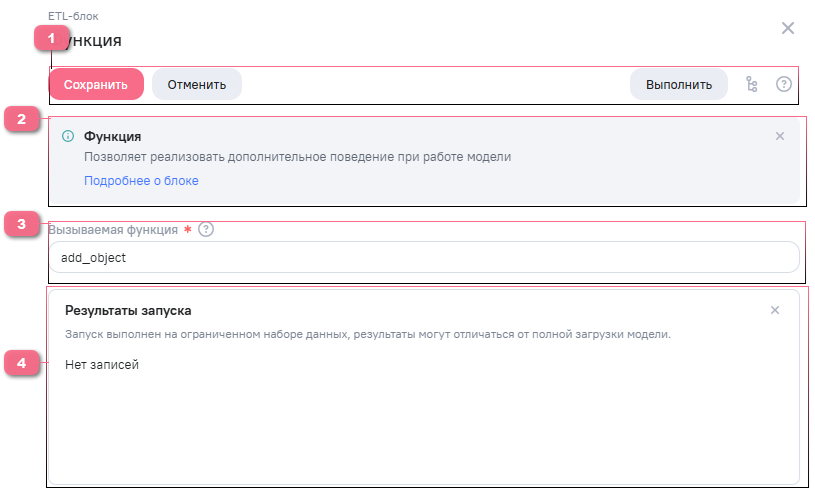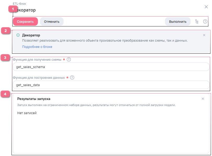 Выполнить - тестовый запуск блока внутри текущей модели. Результат тестового запуска ETL-блока отображаются в блоке Результаты запуска. Если в процессе запуска возникнут ошибки, отобразится текст ошибки;