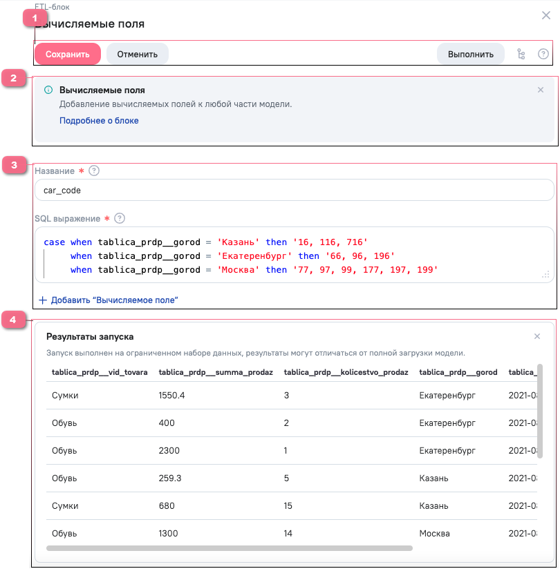 Вычисляемые поля - блок предназначен для добавления вычисляемых полей к любой части модели. Вычисляемое поле задается названием и выражением для вычисления значения поля. При указании выражений вычисляемых полей используется Spark SQL;