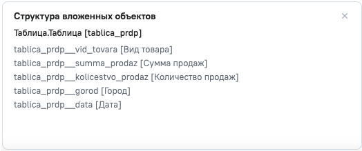 Структура вложенных объектов - просмотр структуры полей всех вложенных в ETL-блок объектов. В структуре указаны параметры полей объектов - Наименование в модели и Алиас в квадратных скобках;