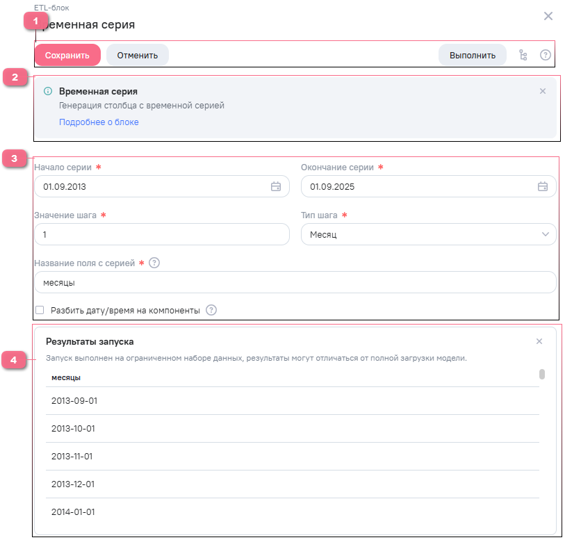 - Название поля с серией - наименование столбца в модели, в котором будет сохранена временная серия;