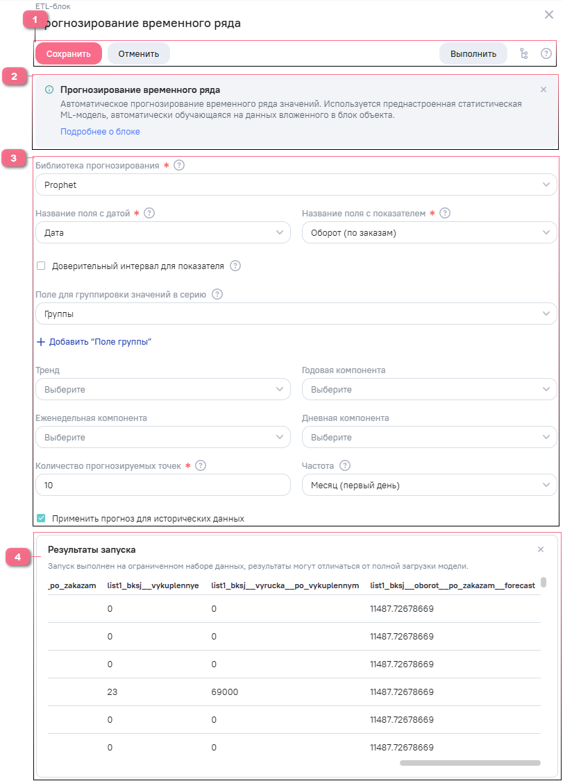 - Количество прогнозируемых точек - количество точек, на которое необходимо спрогнозировать временной ряд. Размерность точек определяется значением настройки Частота;