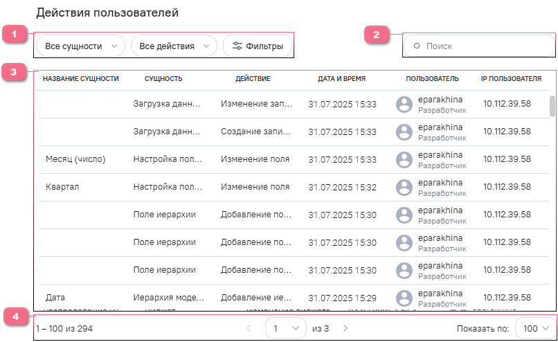 • Пользователи - фильтр по пользователю, который совершил действие;