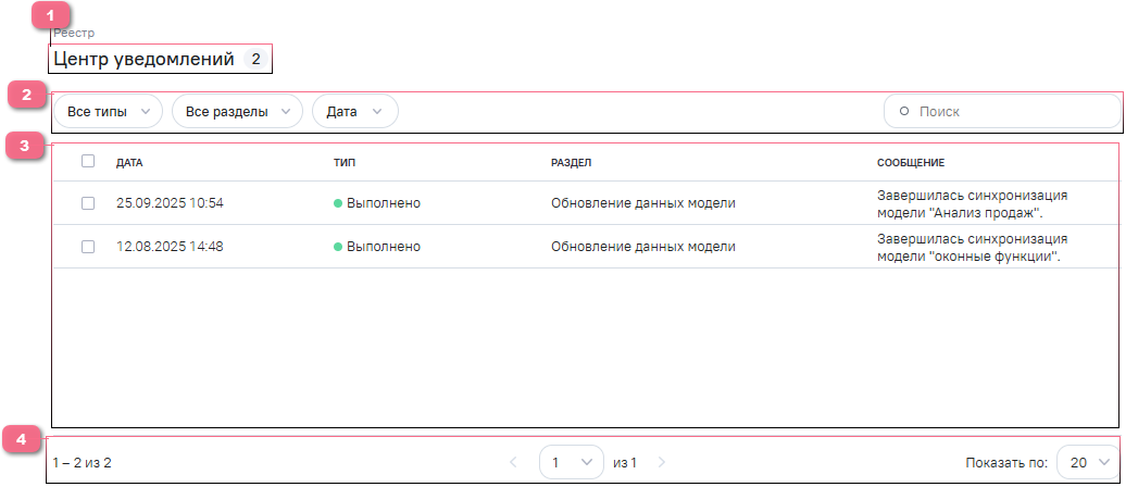 Реестр уведомлений содержит следующие элементы интерфейса: