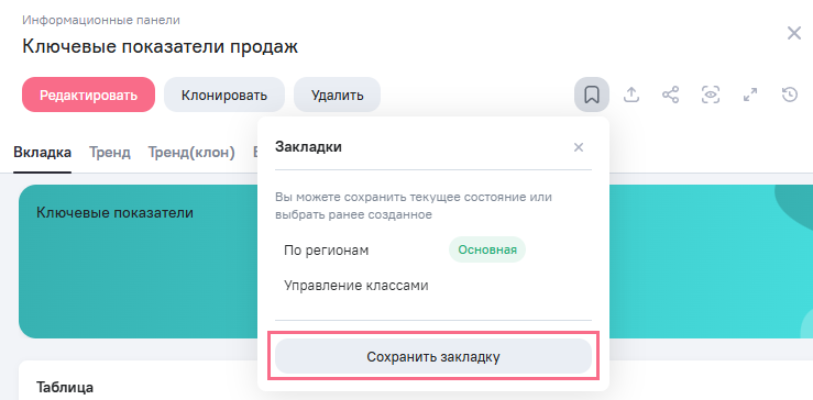 Закладка - это сохраненное состояние информационной панели после изменений в режима просмотра, предпросмотра и просмотра панели по внутренней ссылке. С помощью закладки можно сохранить: